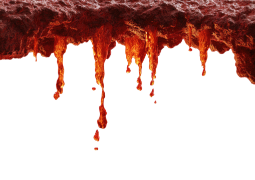 Earth's crust cracking, revealing a deep chasm filled with flowing liquid lava. Transparent background