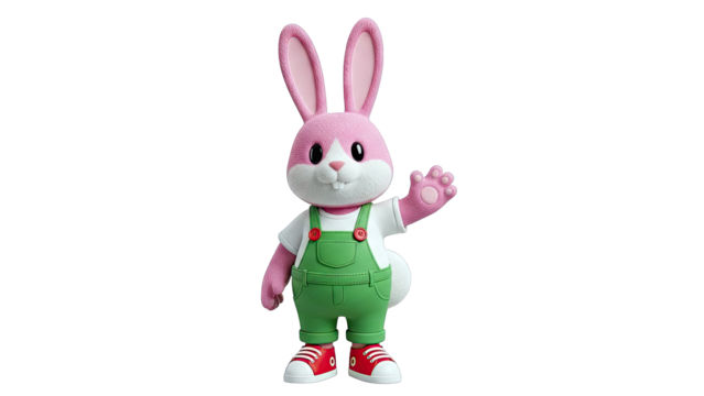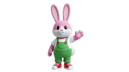 Pink Cartoon Bunny Waving Hello in Overalls and Sneakers