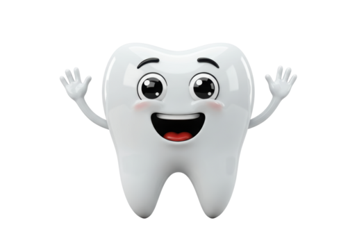 Isolated cartoon tooth smiles and waves hello, dental health mascot welcomes you