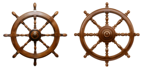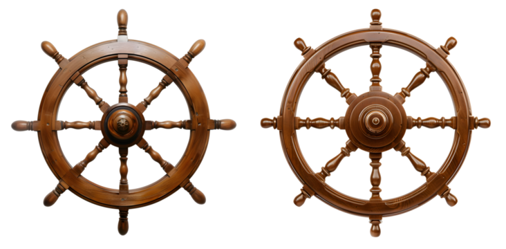 Classic maritime helm wheel crafted from polished wood with decorative turned spokes, isolated on a transparent background