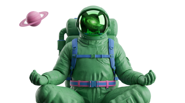 Space traveler meditating in serene pose, visualizing a vibrant galaxy in helmet