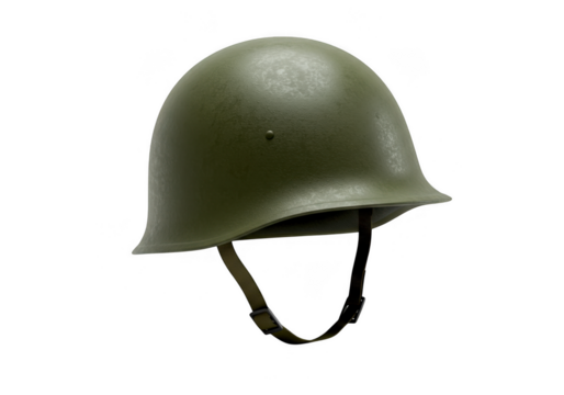 A classic olive green military helmet with a chin strap isolated on transparent background