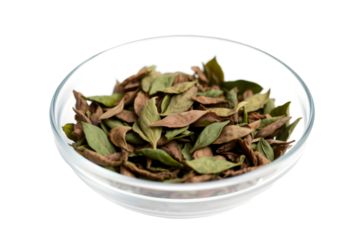 dried green heena leaves in a glass bowl, herbal Heena leafs