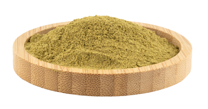 A wooden bowl overflowing with vibrant green powder, two leaves beside it