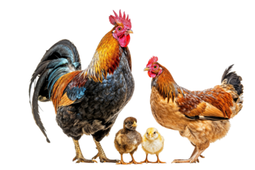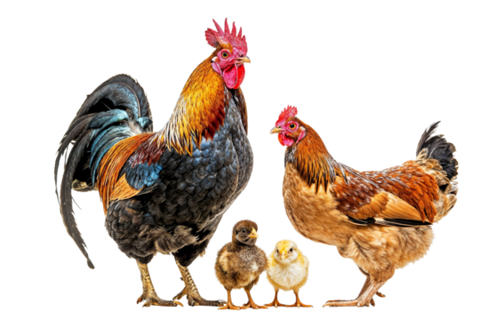 Vibrant Rooster and Hen with Chicks on Transparent Background