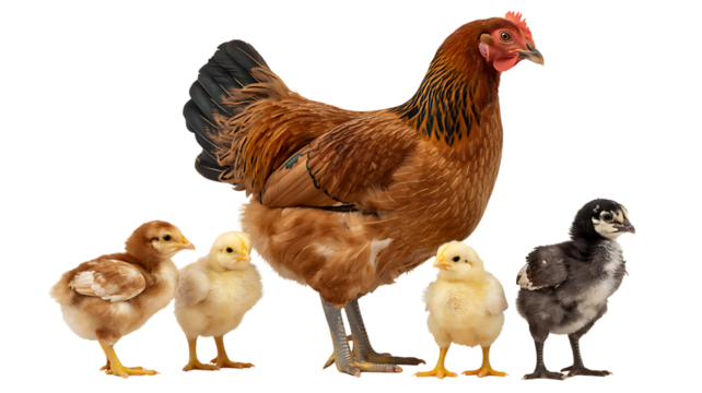 A collection of three hens with varying feather patterns standing alongside fluffy chicks. Isolated on a transparent background, ideal for educational and farm-related projects.