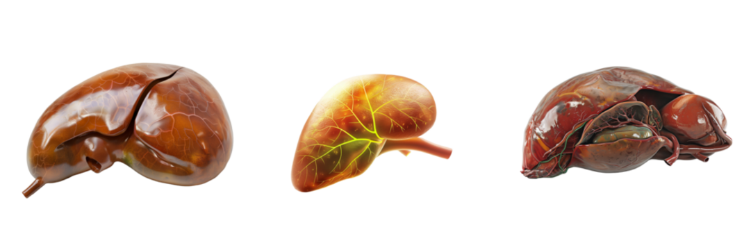 Three Dimensional Models of Human Liver Anatomy Showing Different Views and Internal Structures isolated on transparent Background