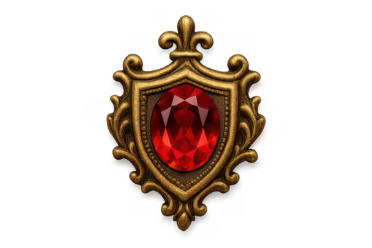 Gold heraldic crest with red gemstone on transparent background