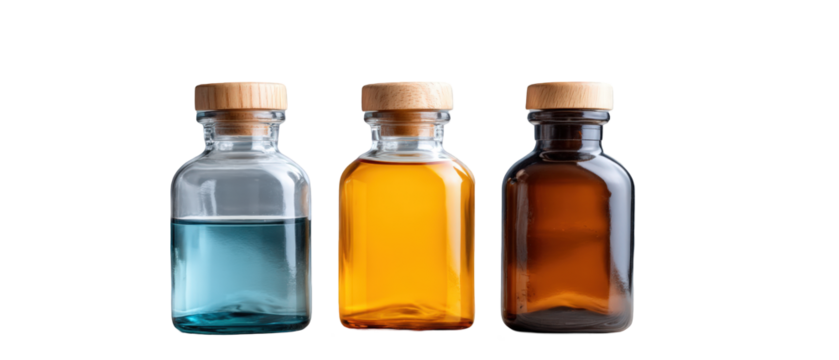 Three glass bottles containing colorful liquids on a white background, showcasing their unique hues