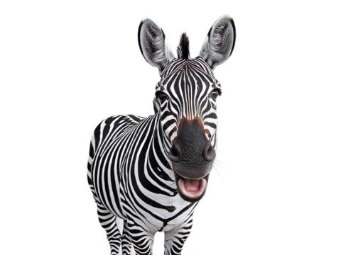 Zebra with Mouth Open Gazing at Camera Against a Clean, White Surface