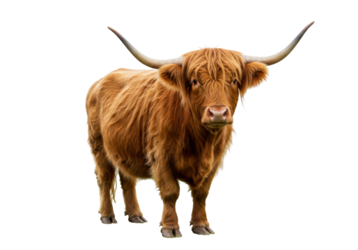 Isolated reddish-brown Highland cattle, a Scottish breed of rustic cattle with long horns