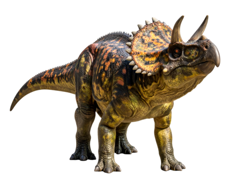 Isolated Triceratops with horns, beak, frill, and armor, in front view ready to attack