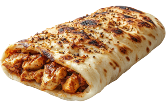 Delicious grilled chicken wrap with spices and herbs served on a wooden table at lunchtime