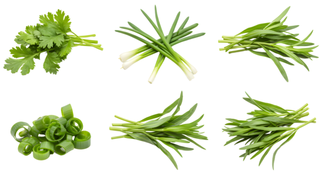 Fresh green herbs including cilantro and various types of scallions arranged neatly on a white background, ideal for culinary use
