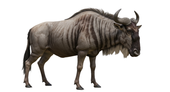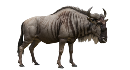 A rugged wildebeest with curved horns, a shaggy mane, and a dirt-streaked coat stands against a white background.