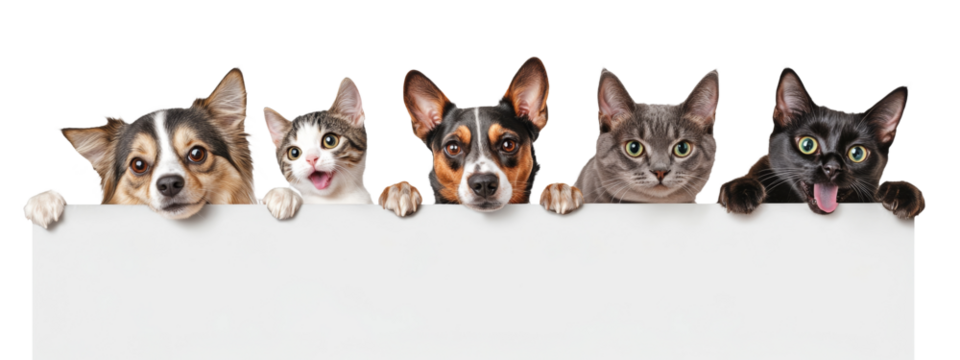 High-Quality PNG Cats and Dogs Peeking Over White Web Banner Isolated on White Background – High Resolution
