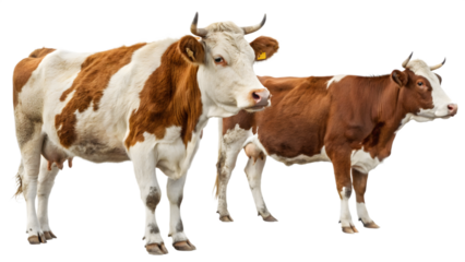 two serene hereford cows with distinctive brown and white coats, one facing forward, the other 3/4 profile, isolated on a seamless transparent infinite plain studio background with soft shadowless