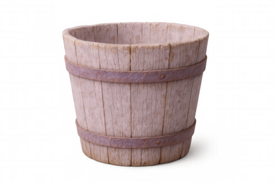 Weathered wooden bucket, metal-banded, resting against transparent backdrop, highlighting vintage craftsmanship and rural heritage