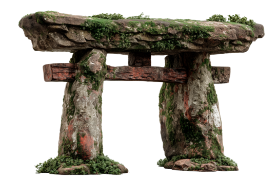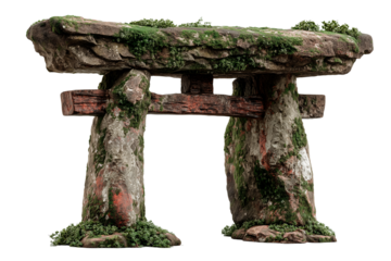 Granite structure with weathered surface and green moss at an ancient site during daytime