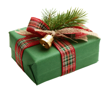 Green Christmas present wrapped with red plaid ribbon, pine branch, and golden bell, traditional festive gift symbolizing winter holiday joy, warmth, and celebration
