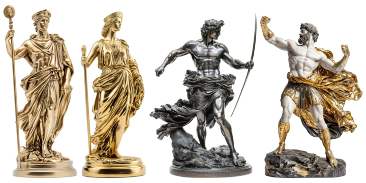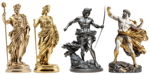 Golden and silver statues of Greek gods, showcasing intricate details and dynamic poses