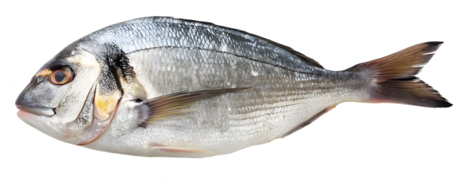 A single silver fish with visible scales and fins isolated against a black background in a studio shot on transparent background