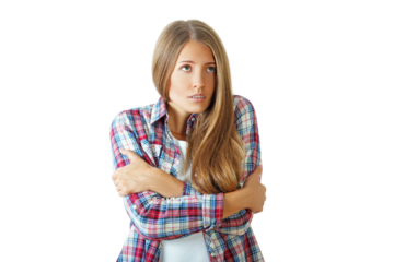 Woman in a plaid shirt hugging herself, looking worried, isolated on a white background. Concept of anxiety or cold