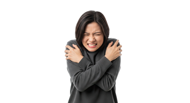 A young woman with glasses hugs herself tightly, appearing to feel cold or discomfort on a transparent background