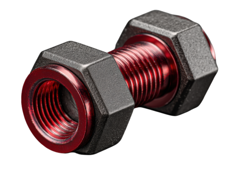 Threaded Red Bolt with Hex Nuts on Dark Surface