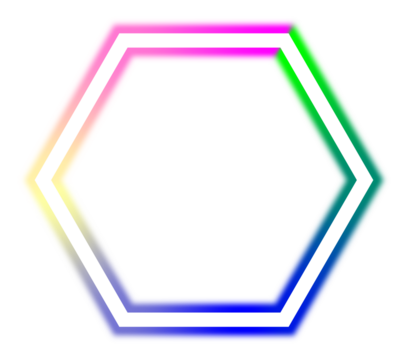 A vibrant glowing hexagon frame with rainbow gradient on a black background