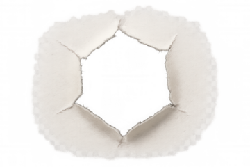 Torn white paper scraps creating a hexagon shape, showing imperfect, rough edges and texture. Transparent background