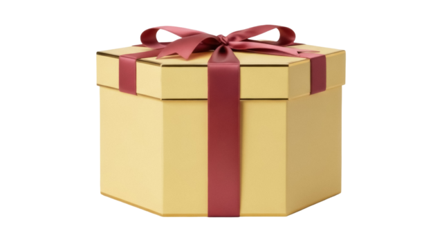Elegant golden hexagon gift box with red ribbon isolated PNG, present for special occasions and celebrations on transparent background
