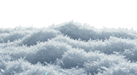 Pristine, fluffy powder snowdrift with sharp hexagonal ice crystals, macro studio shot on a stark white background with copy space. Concept of winter luxury and festive purity