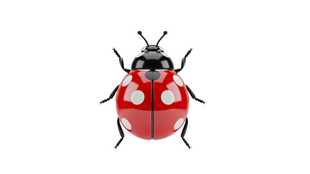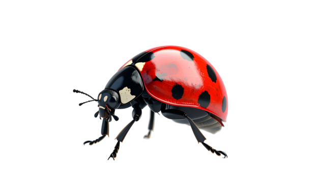 Close-up of a ladybug with a shiny red shell and black spots against a black backdrop