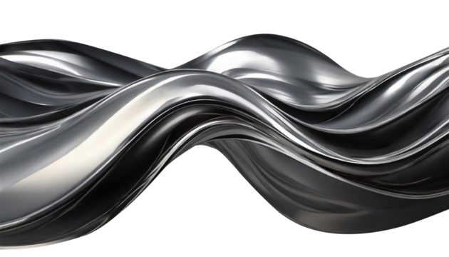Abstract fluid metal bent form. Metallic shiny curved wave in motion. Cut out design element steel texture effect.