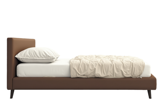Modern brown kingsize bed with white and cream linen from side view, transparent isolated png
