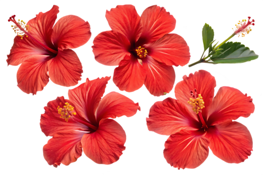 Red Hibiscus Flowers on Transparent Background, Hibiscus rosa-sinensis. Set of four tropical flower blossoms isolated on white.