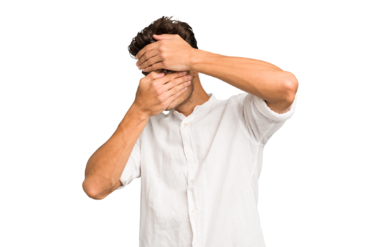 Young handsome caucasian man isolated on white background blink at the camera through fingers, embarrassed covering face.