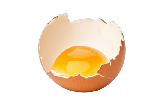 Hatching Potential: A Cracked Egg Shell Revealing a Golden Egg Yolk Inside. On a White or Clear Surface PNG Transparent Background.