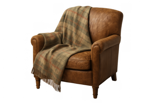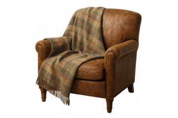 Comfortable brown leather armchair featuring a green and brown tartan plaid throw blanket, isolated on a transparent background