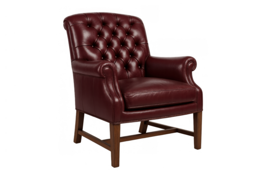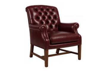 Red leather tufted armchair isolated on transparent background, vintage classic furniture for home and office decor
