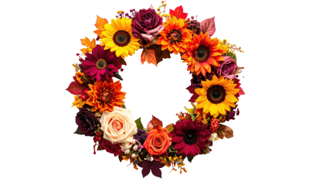 A vibrant floral wreath featuring sunflowers, roses, and fall foliage in shades of red, orange, and yellow