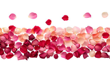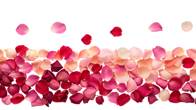 Graceful fall of red rose petals: distinct crimson fragments float and tumble across a bright white sky, creating a lively yet elegant romantic cascade ideal for celebrations, invitations, and floral