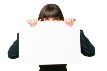 Little girl over isolated chroma key background holding an empty placard and hiding behind it