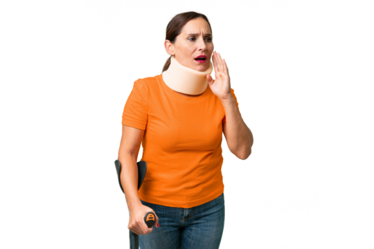 Middle-aged caucasian woman wearing neck brace over isolated background shouting with mouth wide open to the side