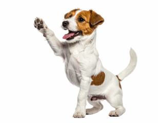 Cute Jack Russell Terrier Puppy Raising Paw for High Five, Isolated on Transparent Background