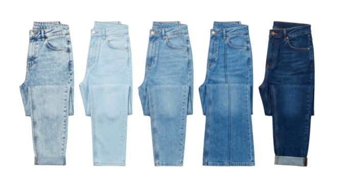 Collection of five different styles of denim jeans laid flat with isolated transparent background