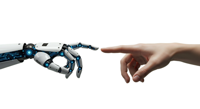 AI hand with semi-transparent glowing fingers, human illuminated by blue wiring, technological wonder high five. Isolated on transparent background, png