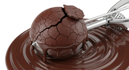 Melting Cracked Chocolate Scoop Dripping Into Rich Chocolate Sauce
