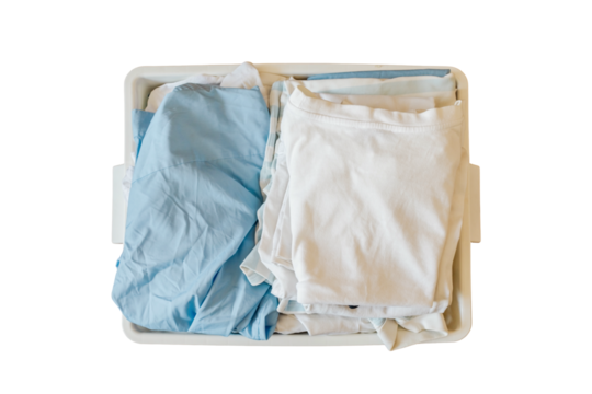 White Plastic Laundry Basket with Folded Blue and White Linens Isolated on Transparent Background. Modern Concept of Household Chores, Home Organization, and Professional Cleaning Services
